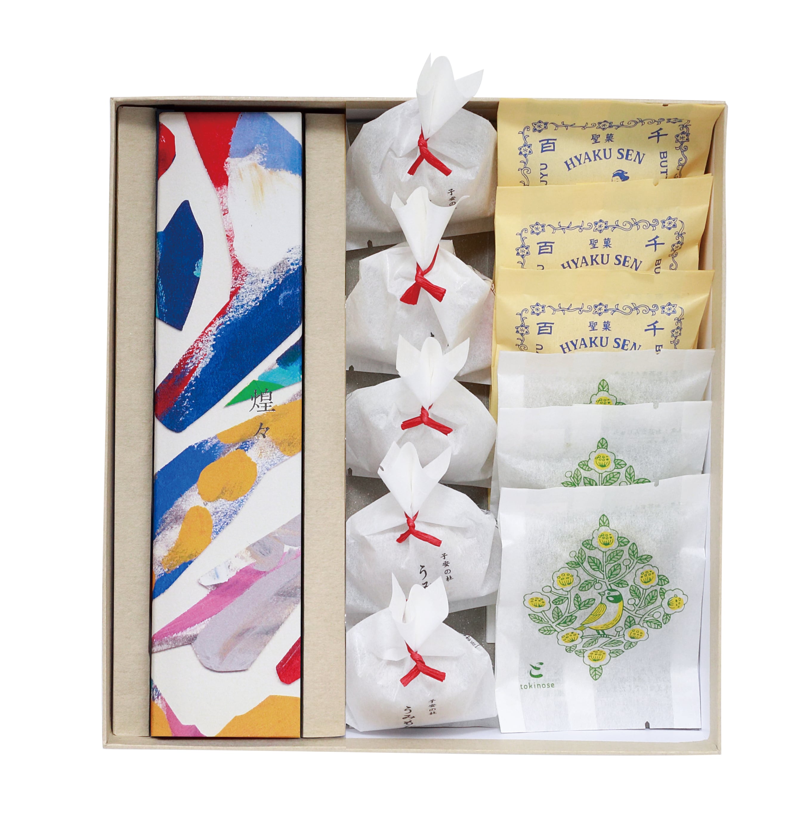 煌々x1棹、うみもなかx5個、お茶まんじゅうx3個、百千万十x3個が入った秋冬限定のお詰め合わせです。