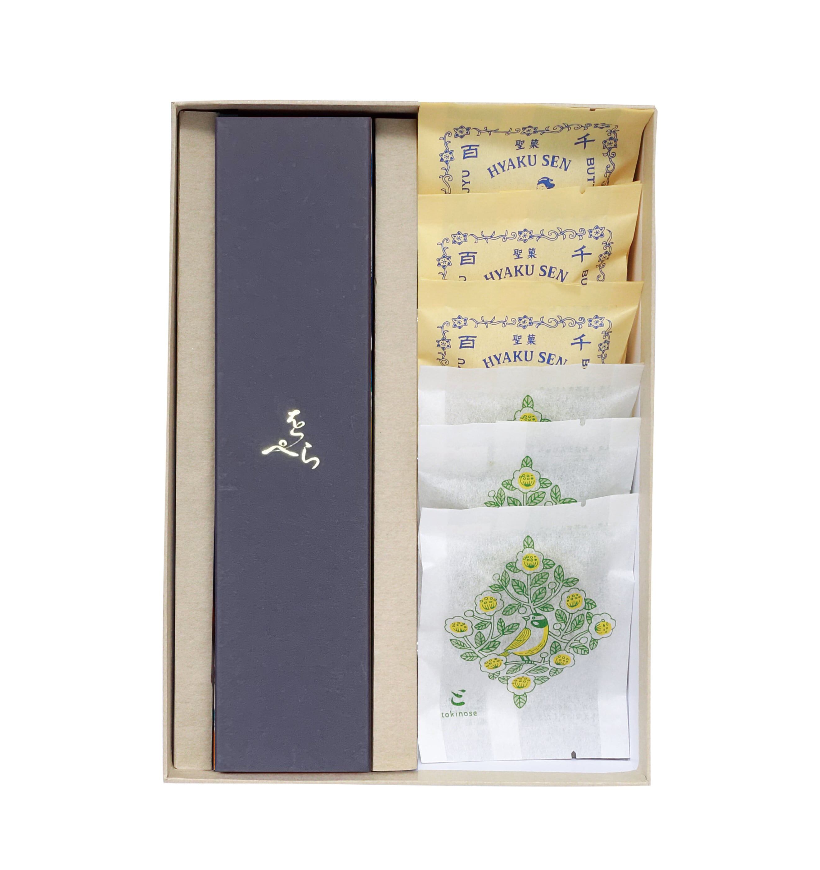 をぺらx1棹、百千万十x3個、お茶まんじゅうx3個入ったお詰合せです。